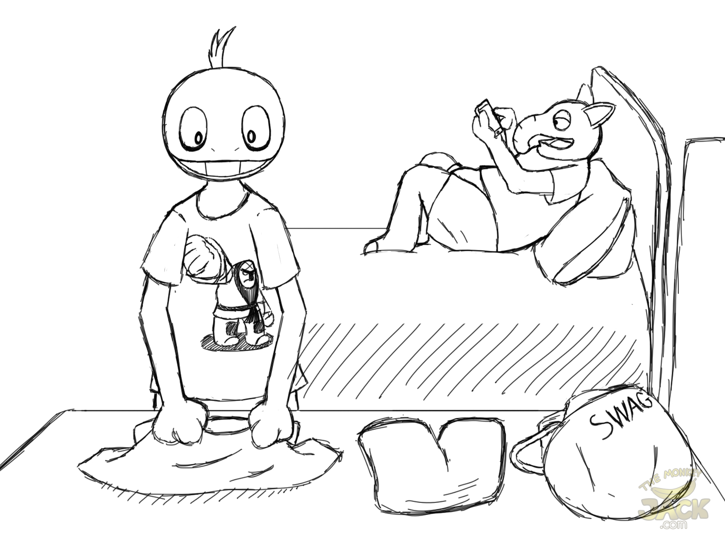 The Scraggy takes a brief pause to lay out T-shirt after T-shirt on the bed, even full outfits themed with various fandom icons. "Man," he chuckles, admiring his haul, "If I had known I'd get so much clothing at the convention, I wouldn't have bothered to pack any of my own from home."