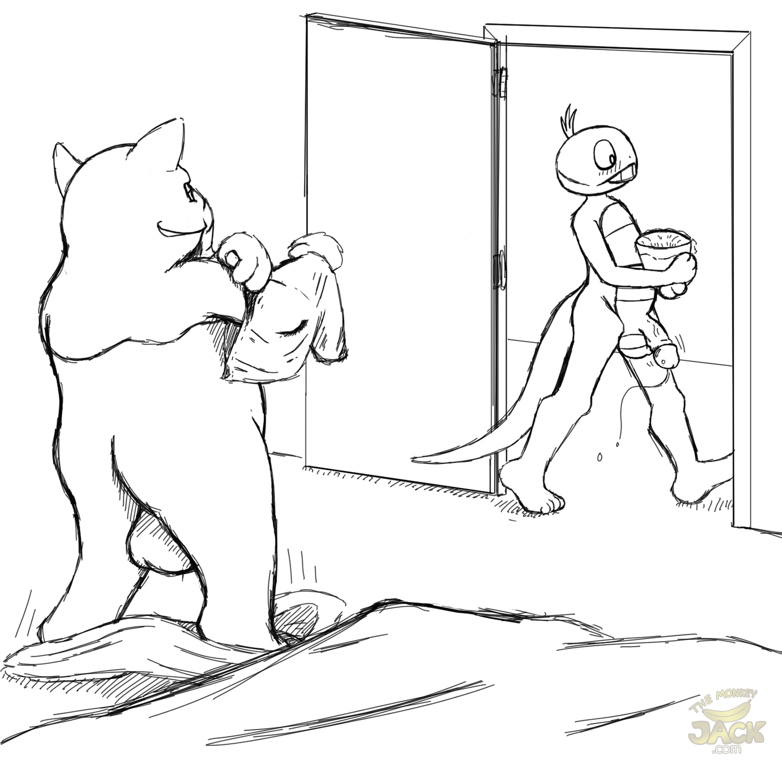 Scraggy crosses the room and opens the front door, baring all as he struts off down the hall, leaving a light trail of pre-cum on the floor.