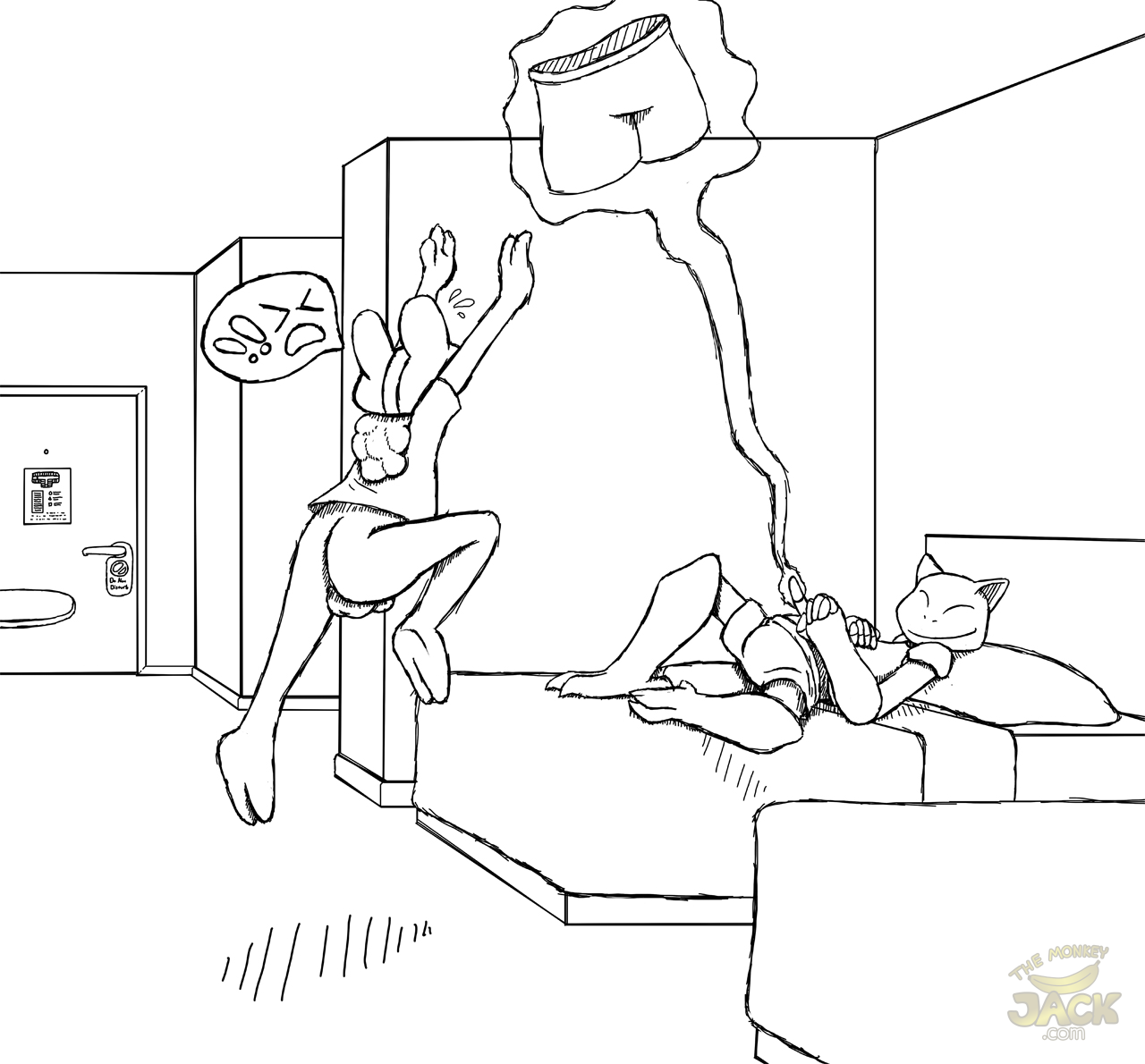 Without warning Froakie feels his pants drop to his ankles and slip away when he jumps in surprise. Turning back to the room, he sees Abra giggling from his bed while using his telekinetic powers to float the pants near the ceiling. “H-hey!”
