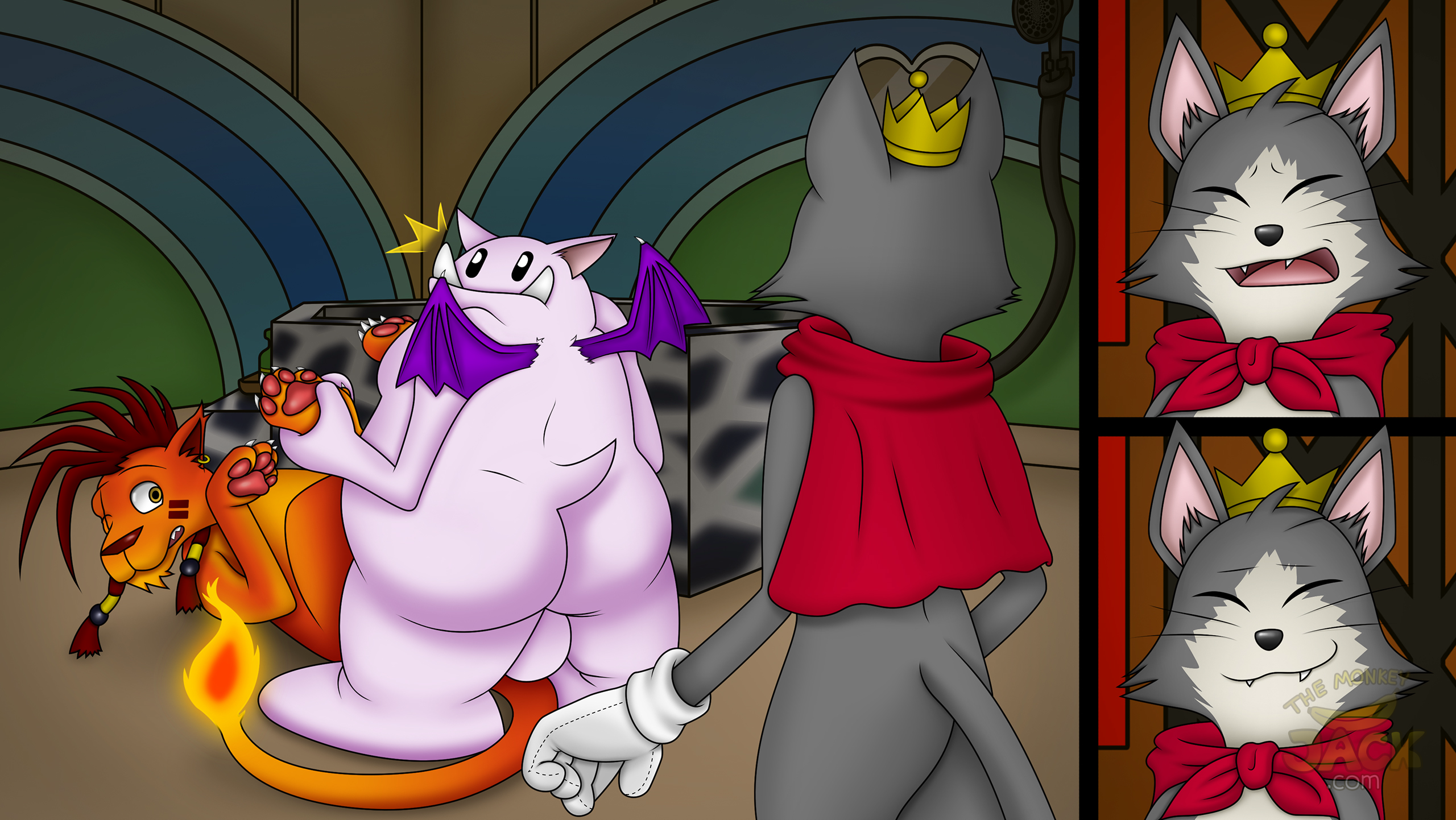 Cait Sith walks in on his moogle friend making sweet love to Red XIII. But he was at the Honeybee Inn for a reason, so his surprise turns out to be a pleasant one, and he happily joins in the fun.