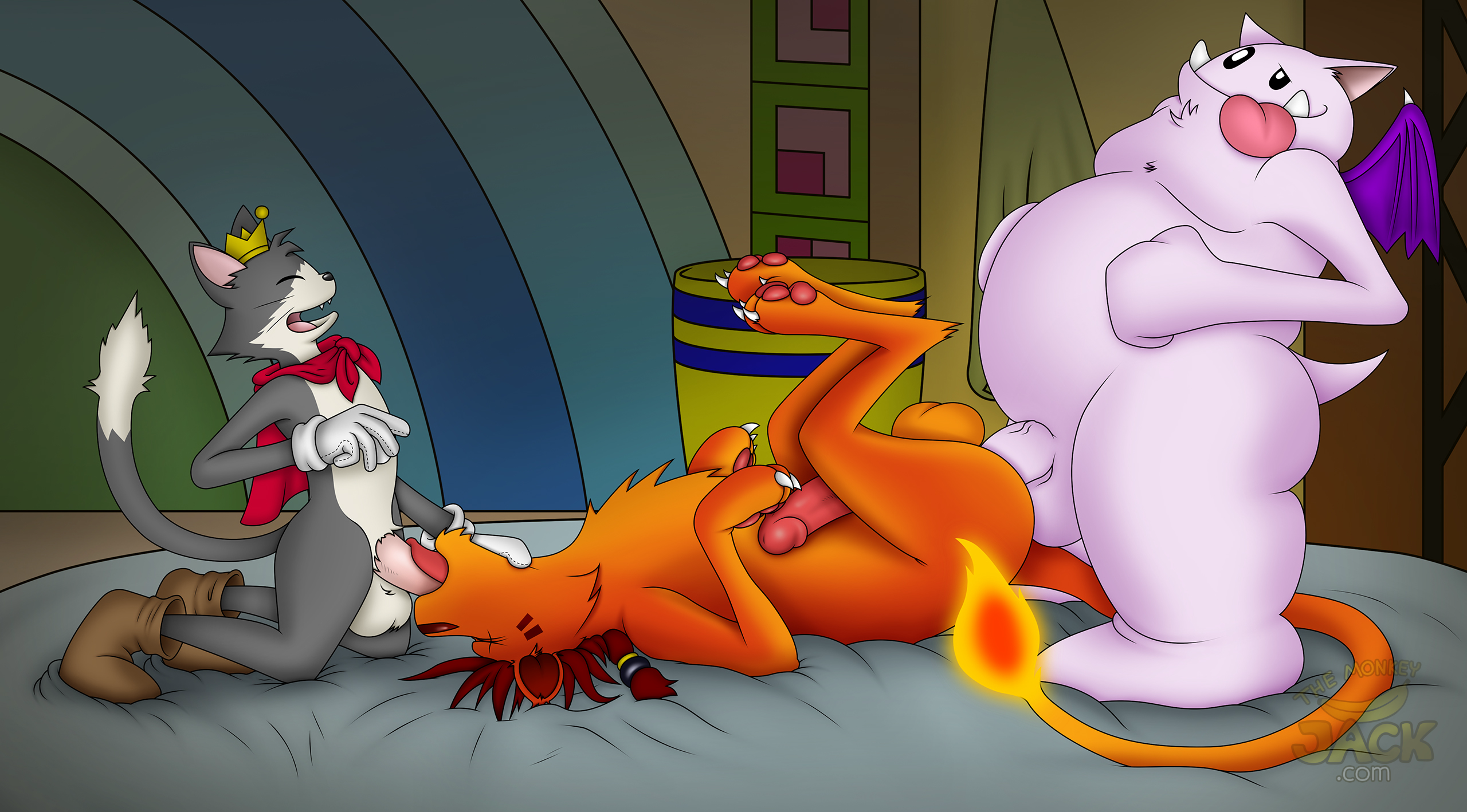 Cait Sith walks in on his moogle friend making sweet love to Red XIII. But he was at the Honeybee Inn for a reason, so his surprise turns out to be a pleasant one, and he happily joins in the fun.